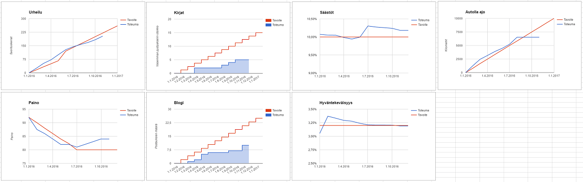 Tästä viisastuneena lupaan itselleni, että mikäli vielä ensi vuonna harjoitan samantyyppistä itseni ruoskimista, niin en koske tavoitteisiin kesken vuoden. Sen verran pitää itseään tuntea että tavoitteet saa kerralla järkevälle tasolle. Jää sitten ainakin vähemmän jossiteltavaa. Ja parempi mieli. Toivottavasti.