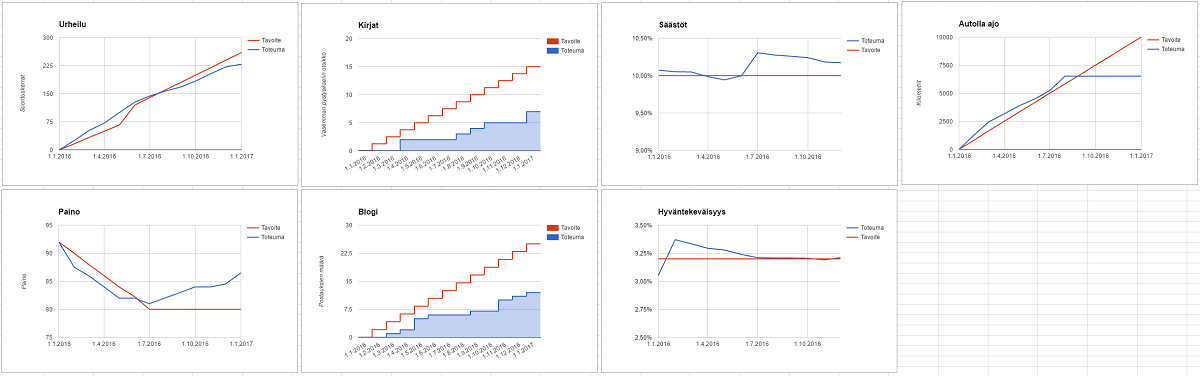 Vuosi 2016 alkoi jälleen tavotteiden asetannalla. Tänä vuonna tarkoituksena oli asettaa mahdollisimman yksiselitteisiä tavotteita, joita voisi myös helposti mittaroida. Näin myös tapahtui. Päätin myös alkaa julkaista edistymistäni, jotta saisin pidettyä motivaatiota yllä julkisen nöyryytyksen pelossa. Melko hyvin olen jaksanutkin tilannetta päivittää, mutta jälkikäteen en ole varma siitä että auttoivatko ne minua ponnisteluissani. Jotenkin tuntuu, että sitä on kuitenkin panostanut niihin asioihin, jotka itsestä on tuntunut mielekkäältä eikä julkisesta paineesta ole ollut asioita muuttamaan. Jos jotain hyvää tästä kokeilusta hakee, niin etenkin vuoden alkupuoliskolla useampi henkilö kyseli kokeilun taustoista ja motivaattoreista, joten ehkäpä jotain hermonystyröitä tämä minunkin kirjoitteluni on aktivoinut.