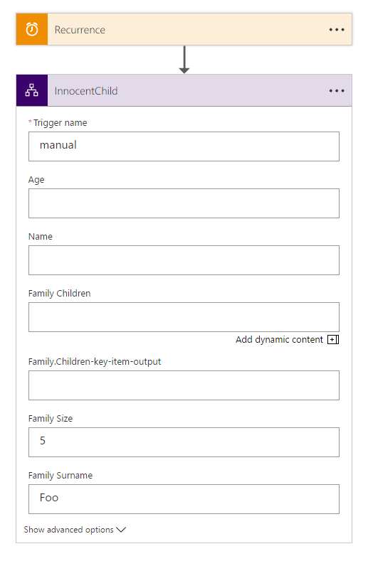 Just one field for the whole body that gets passed to the child as is. Now I was able to implement the process that I needed, but obviously lost some control from the parent-child communication. It also meant that I had to add some extra steps to the child as the input was just a generic json message. For me this means that I can proceed implementing my customer’s case with Logic Apps, but I also really hope that this issue gets fixed or documented better.